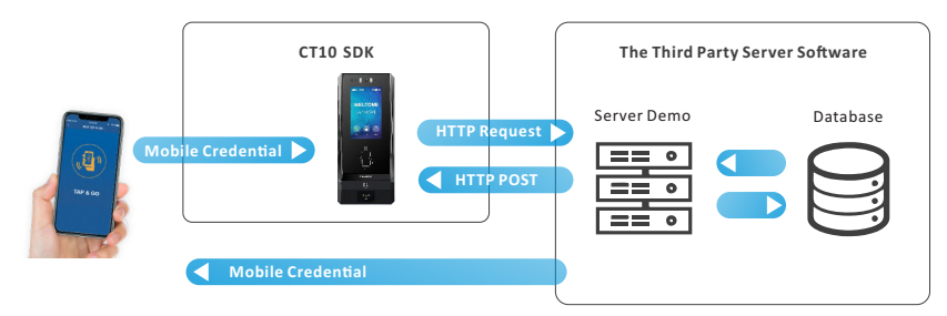 CT10 provides SDK for customer's software development or the third party software system integration for general applications build. CT10 SDK offers developer guidance,libraries,API, HTTP/HTTPs protocol, alongside ConfigCard software, robust demo software including BLE, NFC and QR credentials, server demo and rich example codes to greatly accelerate software development.HTTP and encrypted HTTPS protocols are provided for developer to establish communication between CT10 and user's server software high security and stability.